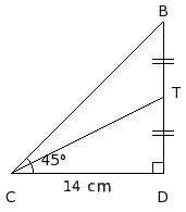 In the given figure, △BCD is a right angle triangle with ∠D = 90° and CD = 14 cm. T is the mid-point of BD. Find ∠TCD using tables.