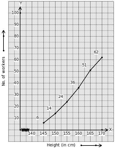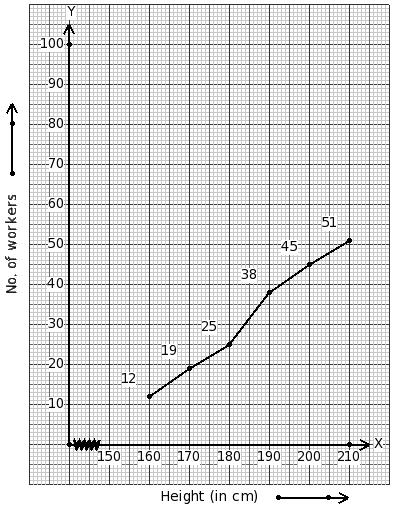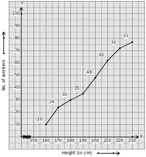 The following ogive shows the distribution of the heights of a group of factory workers. Estimate the median.