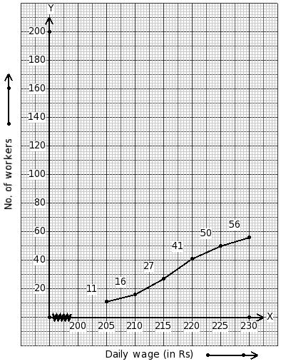 The following ogive shows the daily wages of workers in a factory. Estimate the median.