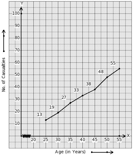 The following ogive shows the number of casualties of different age groups due to accidents in a city. Estimate the median.