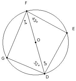 O is the centre of the circle. If ∠DFE = 45° and ∠FDG = 51°, find u°, v°