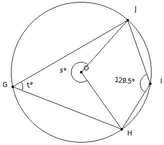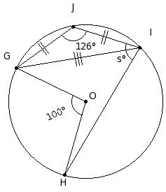 In the given figure, O is the centre of the circle , chord GJ is equal to chord JI. If ∠GOH = 100° and ∠GJI = 126°, find ∠HIJ
