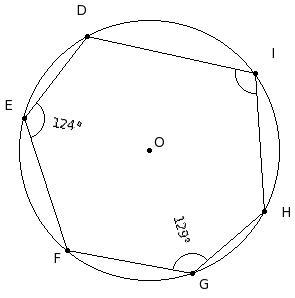 DEFGHI is a hexagon inscribed in a circle. Given ∠DEF = 124° & ∠FGH = 129°, find ∠HID