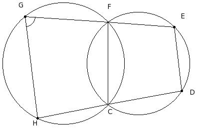 In the given figure, GE and HD are two lines passing through the points of intersection of the two circles at F and C. If ∠HGF = 79° , find ∠FED