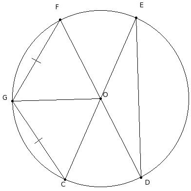 In the given figure, FG & GC are equal length chords, CE and DF are diameters. Given ∠GCO = 58° find, ∠ODE