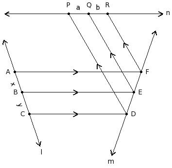 In the given figure, l, m & n are three straight lines such that AF ∥ BE ∥ CD and DP ∥ EQ ∥ FR.Given y = 10 cm, a = 8 cm and x = 10 cm, find 'b'