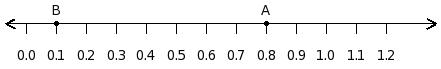 Find the difference of the decimal numbers at the points labelled with letters A and B