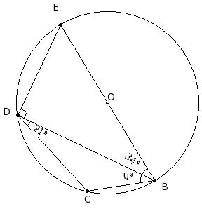 O is the centre of the circle. If ∠DBE = 34° and ∠BDC = 21°, find ∠CBD
