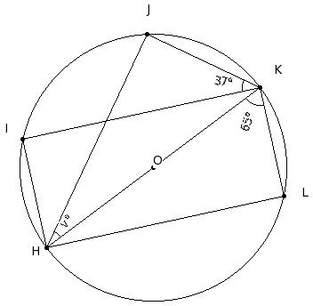 In the given figure, O is the centre of the circle and HK is a diameter. If ∠HKL = 65° and ∠IKJ = 37°, find ∠KHJ