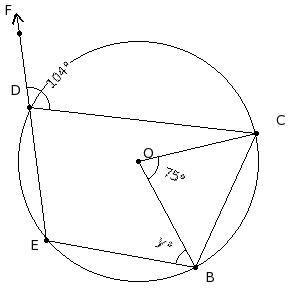 In the given figure, O is the centre of the circle. If ∠BOC = 75° and ∠CDF = 104°, find ∠EBO