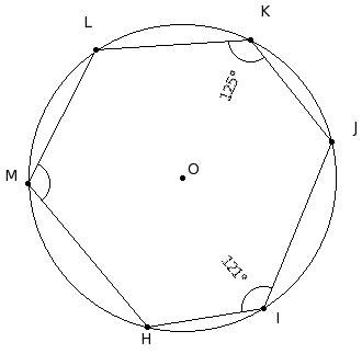 HIJKLM is a hexagon inscribed in a circle. Given ∠HIJ = 121° & ∠JKL = 125°, find ∠LMH