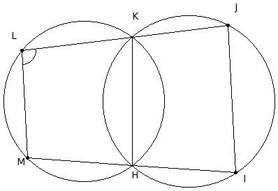 In the given figure, LJ and MI are two lines passing through the points of intersection of the two circles at K and H. If ∠MLK = 94° , find ∠KJI