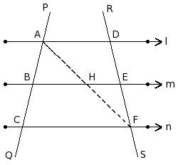 Two transversals PQ and RS intersect them at the points A , B , C and D , E , F respectively.