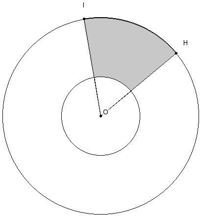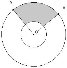 In the given figure, arcs of two concentric circles of radii 11.00 cm and 4.40 cm are drawn with center O. If ∠AOB = 90°, find the area of the shaded region