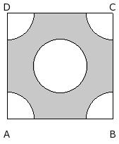 In the given figure, ABCD is a square of side 10.00 cm . At the centre there is a circle with radius 2.50 cm and the same circle quadrants are at the four corners. Find the area of the shaded region.