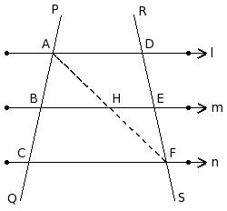 Two transversals PQ and RS intersect them at the points A , B , C and D , E , F respectively.