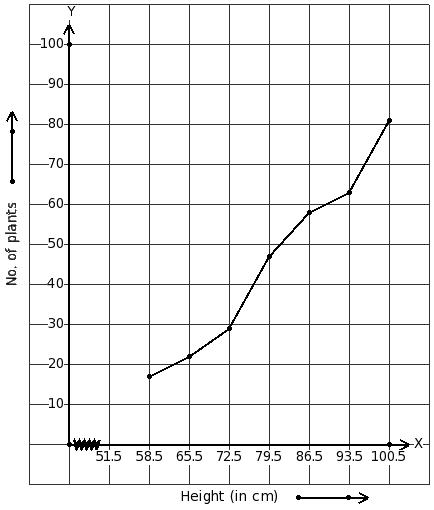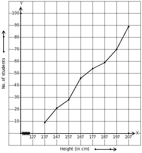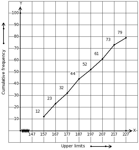 The given ogive represents the heights of workers (in cm) in a factory.
