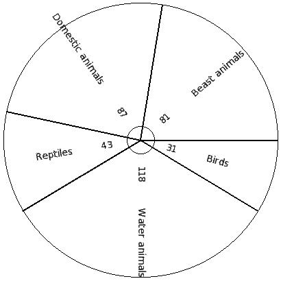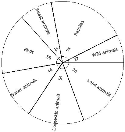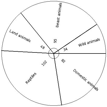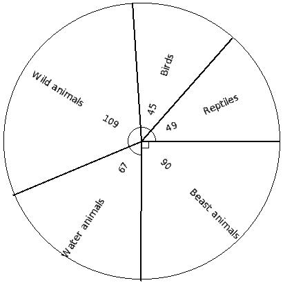 There are 6300 creatures in a zoo as shown below. Find the pie chart sector angle for "Reptiles"