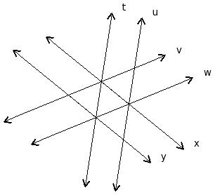 In the given figure, t , u , v , w , x , y are lines in a plane. By looking at the figure, which of the following are true?