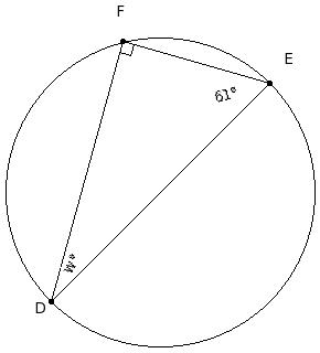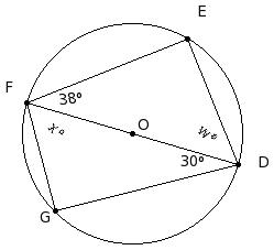 O is the centre of the circle. If ∠DFE = 38° and ∠FDG = 30°, find w°, x°