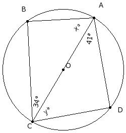 O is the centre of the circle. If ∠ACB = 34° and ∠CAD = 41°, find x°, y°