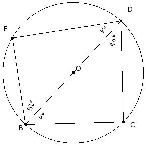 O is the centre of the circle. If ∠BDC = 44° and ∠DBE = 51°, find u°, v°