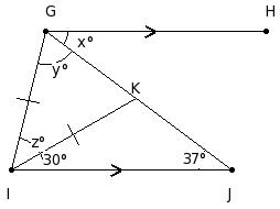 In the given figure, GH ∥ IJ and GI = IK. Find the values of x,y and z.