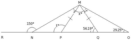 In the given figure, if MP = QM, find the values of x , y , z and t