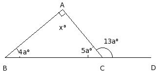 In the given figure, △ABC in which side BC has been produced to D. If ∠CAB = x° , ∠ABC = (4a)° , ∠BCA = (5a)° and ∠ACD = (13a)°, find the values of a and x.