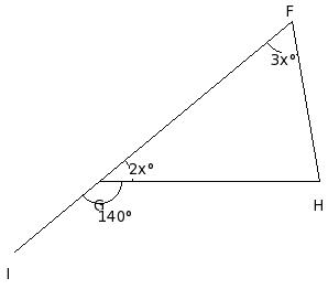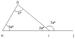 In the given figure, △GHI in which side HI has been produced to J. If ∠IGH = x° , ∠GHI = (3a)° , ∠HIG = (2a)° and ∠GIJ = (7a)°, find the values of a and x.