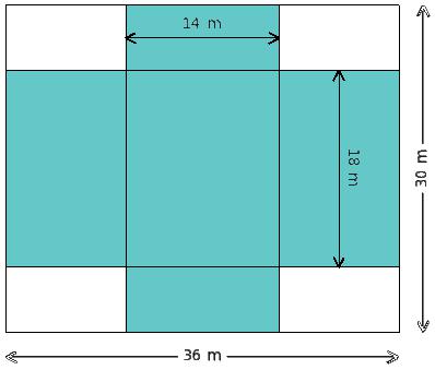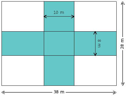 A rectangular field is 38 m by 28 m. It has two paths through its centre, running parallel to its sides.