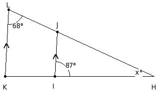 In the given figure, it is given that JI ∥ LK , ∠JLK = 68° and ∠JIH = 87°. Find the value of x.