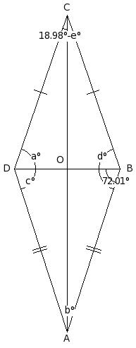 a = 71.02° , b = 18.99° , c = 71.01° , d = 73.02° , e = 18.98°