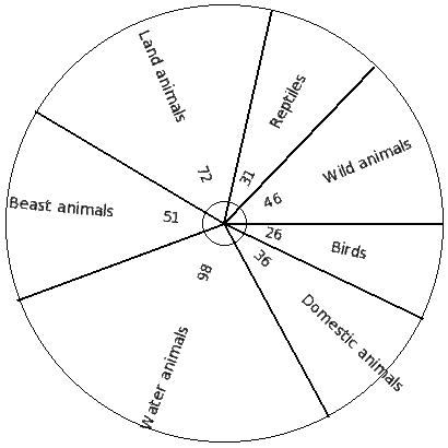 There are 5130 creatures in a zoo as shown below. Find the pie chart sector angle for "Water animals"