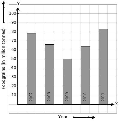 Read the column-graph given below. Find the year that has maximum food grains production.