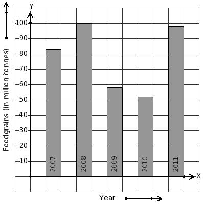 Read the column-graph given below. Find the year that has 98 million tonnes food grains production.