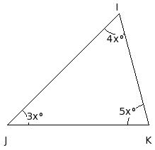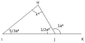 In the given figure, △HIJ in which side IJ has been produced to K. If ∠JHI = x° , ∠HIJ = (1/3a)° , ∠IJH = (1/2a)° and ∠HJK = (1a)°, find the values of a and x.