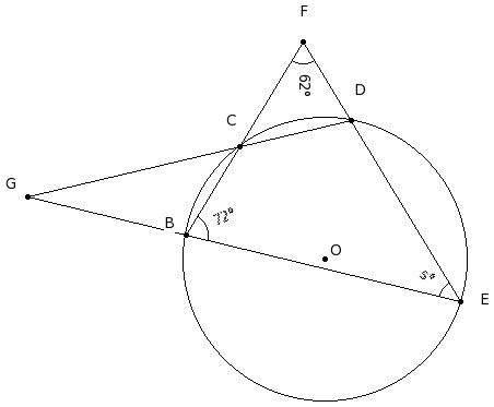 In the given figure, O is the centre of the circle. If ∠CFD = 62° and ∠CBE = 72°, find ∠BED