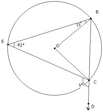 In the given figure, O is the centre of the circle. If ∠BEC = 41° and ∠OBE = 22°, find ∠DCE