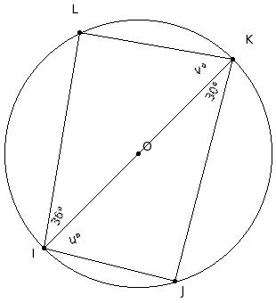 O is the centre of the circle. If ∠IKJ = 30° and ∠KIL = 36°, find u°, v°