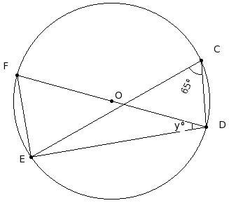In the given figure, O is the centre of the circle and DF is a diameter. If ∠ECD = 65°, find ∠EDF