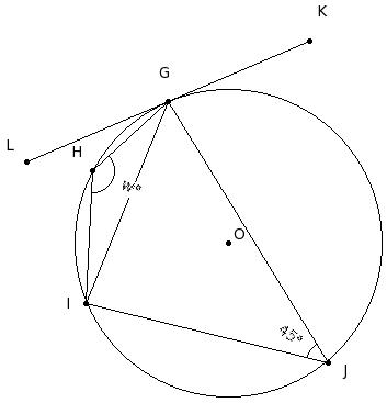 In the given figure, O is the centre of the circle and KL is the tangent at G. If ∠GJI = 45°, find ∠GHI