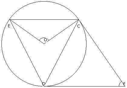 O is the centre of the circumcircle of △CDE. Tangents at C and D intersect at F. If ∠CFD = 55.18° and ∠COE = 110°, find ∠ECD