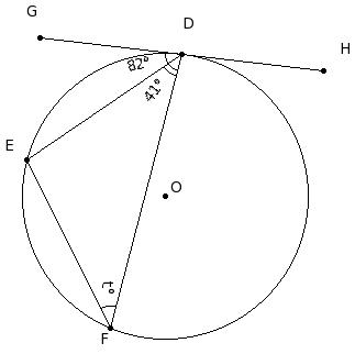 In the given figure, O is the centre of the circle and GH is the tangent at D. If ∠EDF = 41° and ∠GDE = 82°, find ∠DFE