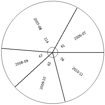 Shown below is the total food grain production of 3510 million tonnes over 5 years. Find the pie chart sector angle for "2010"