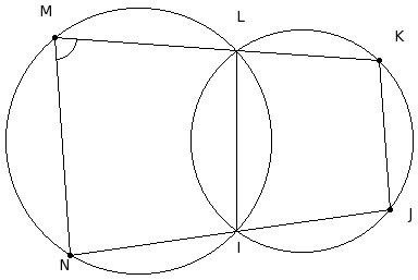 In the given figure, MK and NJ are two lines passing through the points of intersection of the two circles at L and I. If ∠NML = 82° , find ∠LKJ