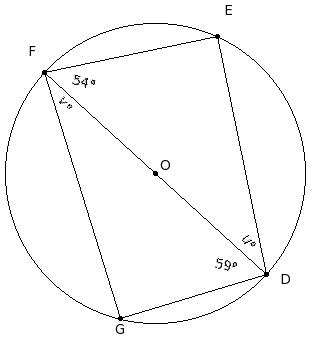 O is the centre of the circle. If ∠DFE = 54° and ∠FDG = 59°, find u°, v°