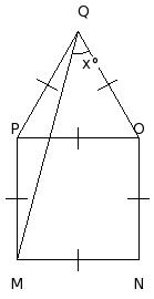 In the adjoining figure, equilateral △POQ surmounts square MNOP. If OQM = x°, find the value of x.