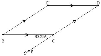 In the adjoining figure, side CD of parallelogram BCDE has been produced to F. If ∠BCF = 33.25° , find the measure of each angle of the parallelogram.
