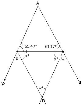 In the given figure, △ABC in which ∠B = 65.47° and ∠C = 61.17°. AD and BC bisects each other. Find the value of z